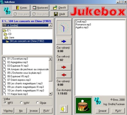 |  | MIDISOFT STUDIO FOR WINDOWS, verze 3.10.02 | Notátor a sekvencer pro Windows. |  | 7117 |  0,7 MB |  0,7 MB |  0,7 MB |  | CAPELLA, verze 2.2 | Notátor, ne příliš dokonalý, není kompatibilní s MidiSoft Studiem. |  | 8203 |  0,8 MB |  0,8 MB |  0,8 MB |  | VOLUME | Program pro ovládání hlasitosti. Jeho výhodou je, že dokáže přednastavit úrovně hlasitosti i záznamu. |  | 7397 |  0,2 MB |  0,2 MB |  0,2 MB |  | JUKEBOX | Přehrávač souborů MP3 a WAV za podpory WinAmpu. |  | 7354 |  0,3 MB |  0,3 MB |  0,3 MB |  | COOL EDIT 96 | Program pro editaci zvukových křivek (WAV). |  | 7805 |  1,4 MB |  1,5 MB |  1,4 MB |  | MP3 COMPRESSOR | Komprese WAV souborů do formátu MP3 |  | 7923 |  1,0 MB |  1,0 MB |  1,0 MB |  | WINAMP | Přehrávač MP3 souborů |  | 7059 |  3,4 MB |  3,7 MB |  3,4 MB |  | CD EXTRAKTOR, verze 1.4 | Program pro extrakci zvukových CD do formátu WAV nebo MP3. |  | 7792 |  1,1 MB |  1,1 MB |  1,0 MB |  | MUSIC MATCH JUKEBOX, verze 6.1 | Přehrávač MP3 souborů. Dokáže navíc provádět dekompresi MP3 souborů do formátu WAV. |  | 7310 |  8,4 MB |  8,3 MB |  8,4 MB |  | CHROMATIA TUNER, verze 3.1 | Softwarová ladička |  | 7040 |  0,7 MB |  0,6 MB |  0,6 MB |  | GUITAR TUNER | Softwarová ladička |  | 7098 |  0,2 MB |  0,2 MB |  0,2 MB |  | GUITAR TUNER | Softwarová ladička (lepší design, ale horší funkčnost) |  | 6806 |  0,2 MB |  0,2 MB |  0,2 MB |  | MIDI ANALÝZA | Analýza MIDI souborů s detekcí akordové tabulatury |  | 5533 |  0,4 MB |  0,3 MB |  0,3 MB |  | VIRTUAL DUB | Jednoduchý, ale velmi výkonný software pro střih videa, mixování videa se zvukem apod. |  | 5422 |  1,1 MB |  1,0 MB |  1,0 MB |  | DMX | Řídící software k ovládání DMX zařízení (osvětlení). |  | 6192 |  0,8 MB |  0,9 MB |  0,7 MB |  | Sound Forge Export | Sound Forge: export vlastních nastavení |  | 1346 |  0,4 MB | | |  | Win RAR 3.50 CZ | Komprimační software |  | 1381 |  1,1 MB | | |  | VLAKY  | Spořič obrazovky s projíždějícími vláčky |  | 1170 | |  1,5 MB | |  | PLAYBACK  | Správa playbacků při živém představení |  | 763 |  3,0 MB | | |